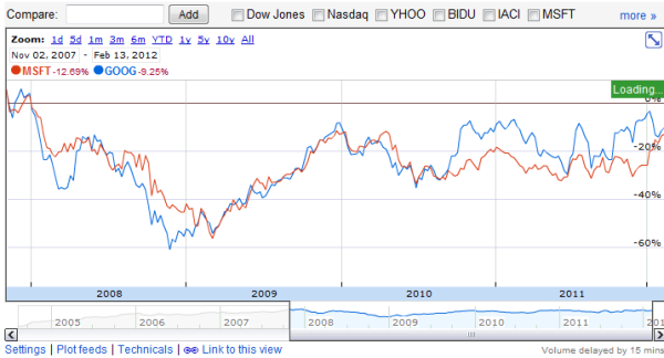 As this chart shows, Google stock is still down about 9% from the peak, and perhaps more importantly, its path tracks Microsoft very closely indeed. Plus Microsoft investors get a dividend, whereas Google investors do not.