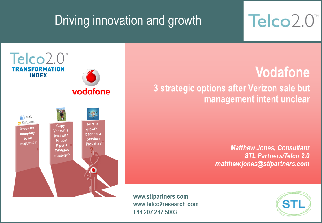 The Telco 2.0 Transformation Index helps telcos, their partners and investors improve returns on strategic investments and activities by moving more swiftly and effectively to new ‘Telco 2.0’ business models that could add up to 50% to their share value. The first tranche of analysis comprises in-depth assessments on Telefonica, Vodafone, AT&T, Verizon, and SingTel, and an overall benchmarking summary analysis providing direct comparisons. The Index assesses their current market performance and positioning, new services, transformative strategies, and future competitive and collaborative abilities against their ‘best-in-class’ peers. There’s more on the benefits and packages here, and please email us at to find out more and arrange an introductory presentation. |